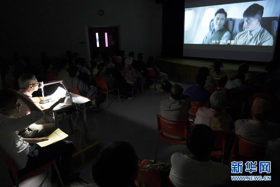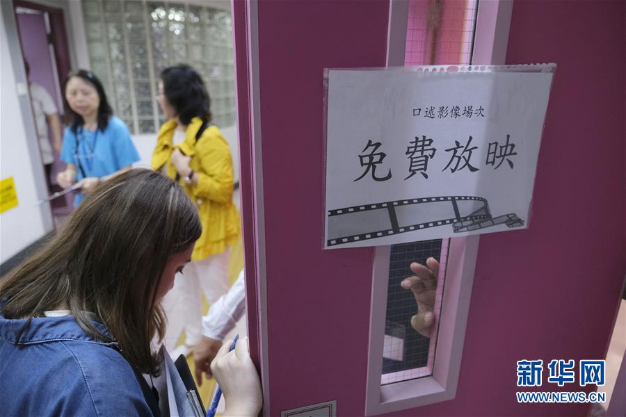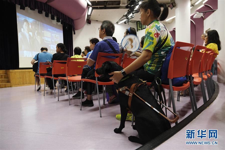 在香港盲人辅导会的一个小礼堂,口述影像员赖子全在口述电影(6月20日摄)。 新华社发(王申 摄)