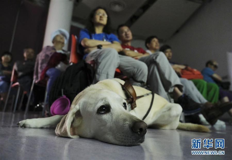 在香港盲人辅导会的一个小礼堂,视障人士林颖芝的导盲犬趴在地板上看着电影屏幕(6月20日摄)。 新华社发(王申 摄)