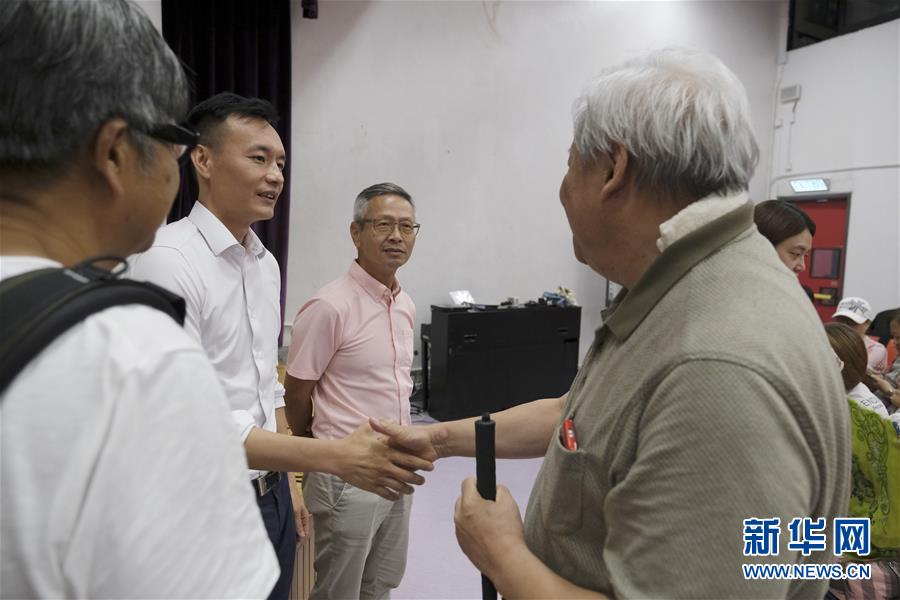 在香港盲人辅导会的一个小礼堂,视障人士在“看”完电影后和口述影像员握手表达谢意(6月20日摄)。 新华社发(王申 摄)