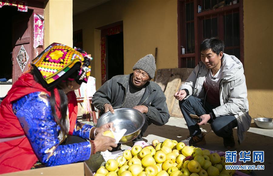 张飞(右一)在四川省阿坝藏族羌族自治州小金县美兴镇甘家沟村通过直播平台帮村民卖苹果(1月8日摄)。新华社记者 李梦馨 摄