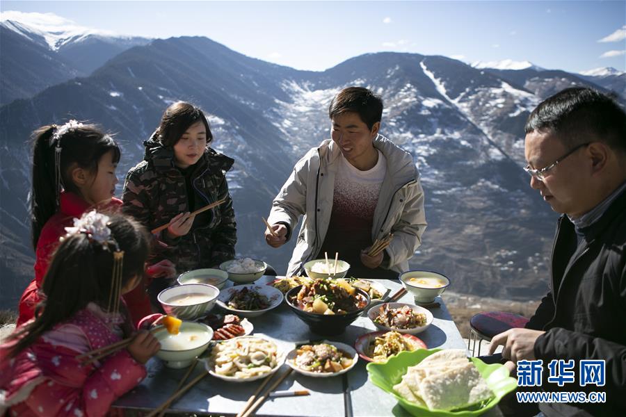张飞(右二)在四川省阿坝藏族羌族自治州小金县美兴镇下马厂村的“忘忧云庭”农家餐厅与客人共进午餐(1月8日摄)。新华社记者 李梦馨 摄