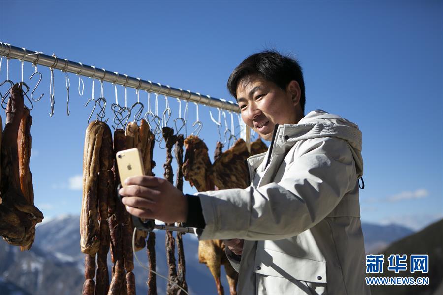 张飞在四川省阿坝藏族羌族自治州小金县美兴镇下马厂村的“忘忧云庭”农家餐厅通过直播卖香肠、腊肉(1月8日摄)。新华社记者 李梦馨 摄