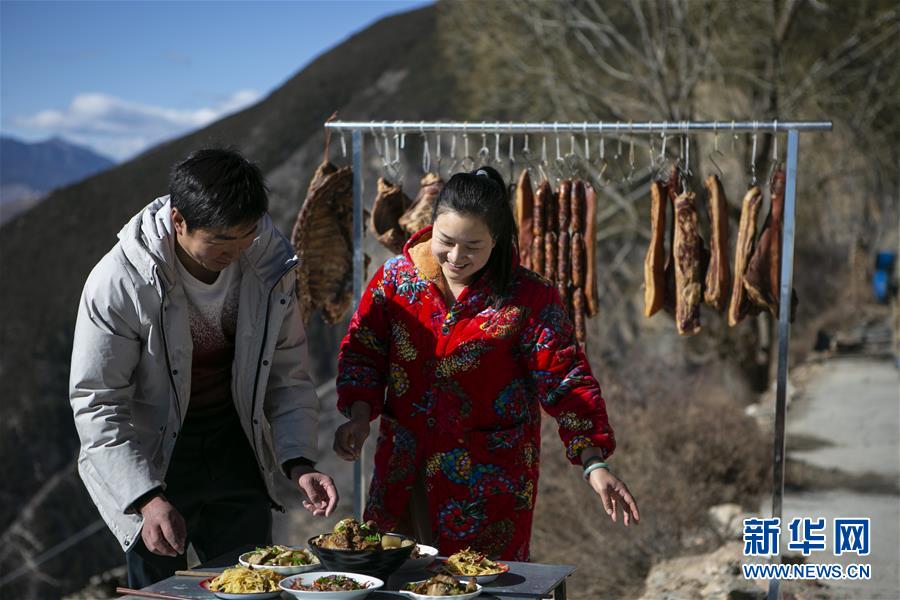 张飞与妻子李萍在四川省阿坝藏族羌族自治州小金县美兴镇下马厂村的“忘忧云庭”农家餐厅为客人准备午餐(1月8日摄)。新华社记者 李梦馨 摄