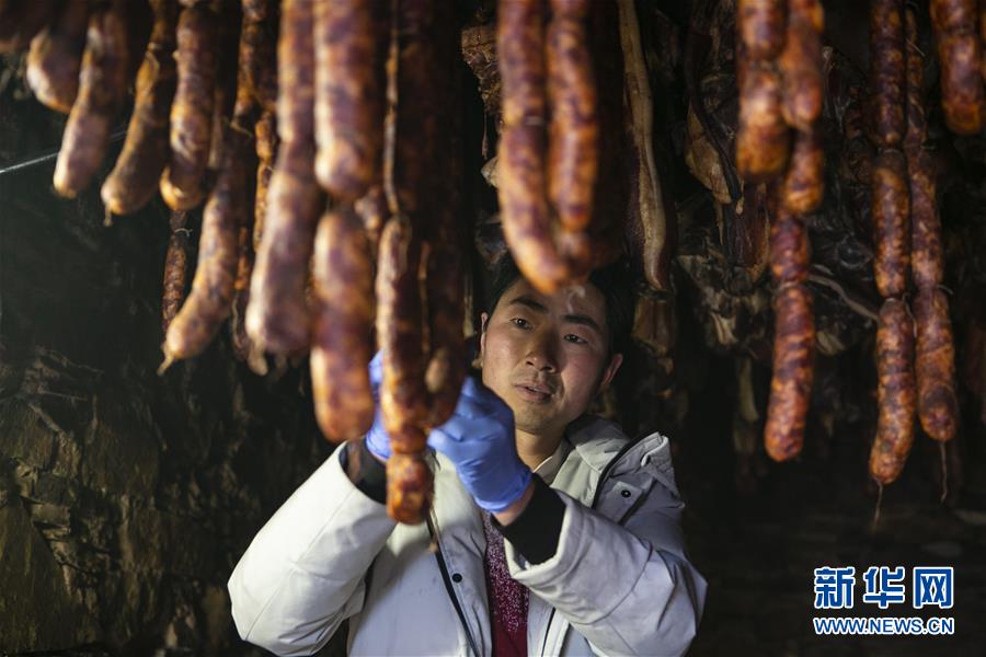 张飞在四川省阿坝藏族羌族自治州小金县美兴镇下马厂村的“忘忧云庭”农家餐厅查看香肠、腊肉(1月8日摄)。新华社记者 李梦馨 摄