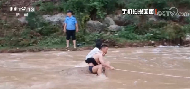 民警赶到现场后发现,小女孩被困在河道中间的石块上,被周围不断上涨的河水吓得大哭。一名民警和一名辅警立即跳到湍急的河水里,准备泅水靠近被困女孩。但是由于河水水流太急而且有回流,同时被困女孩附近的石头上长了青苔非常滑,民警经过几次尝试却始终无法靠近被困女孩。岸边的群众立即找来绳子,一头绑在民警身上,另一头由岸边群众拉着,就这样民警再次跳进湍急的河水慢慢靠近被困女孩。