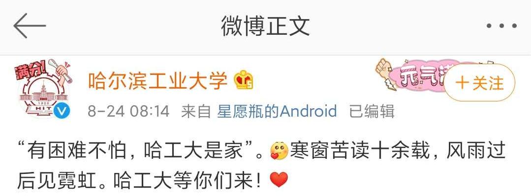 8月24日,哈尔滨工业大学在其官方微博上表示,“有困难不怕,哈工大是家。”寒窗苦读十余载,风雨过后见霓虹。哈工大等你们来!短短的二三十个字,饱含温度。