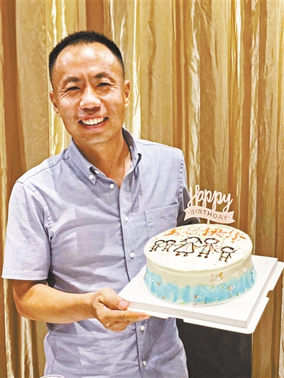 8月5日是申军良43岁生日,他亲手做的蛋糕,上面画着夫妻二人拉着三个孩子一家团圆的画面