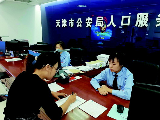 天津市民政局事业处工作人员朱娜(左一)在天津市公安局人口管理总队为受助人员办理落户手续。