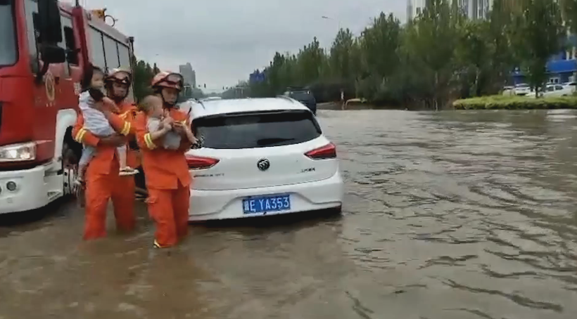 安心的怀抱!河北邢台暴雨消防员怀抱两儿童转移
