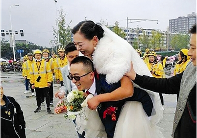 10月18日,是成都小伙练虎和女友曾腊梅结婚的大喜日子,没有豪华的迎亲车队,也没有摄像跟拍,却自发来了一大波外卖骑手捧场。