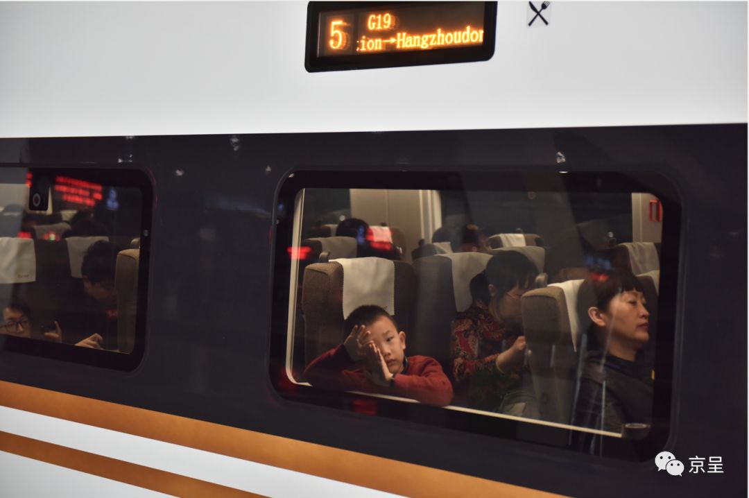 小乘客在首趟由北京开往杭州的“复兴号”动车组G19窗前张望。