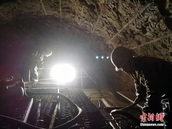 图为隧道内工人依靠灯光作业。 王小军 摄