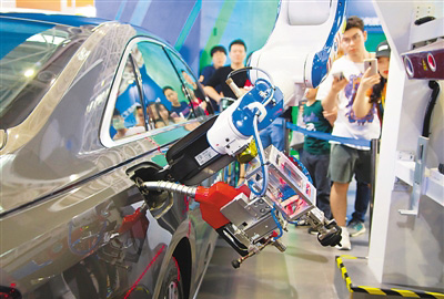 日前,由中化能源自主研发的智能加油机器人亮相福州。该机器人可以自动打开汽车油箱盖,抓取油枪,自动完成高度模拟人工加油的标准动作。在智能加油的同时,机器人还能自动判断车型和停靠角度,不断对车辆型号、停靠姿态、油箱口位置进行识别判断。图为机器人正在给汽车加油。