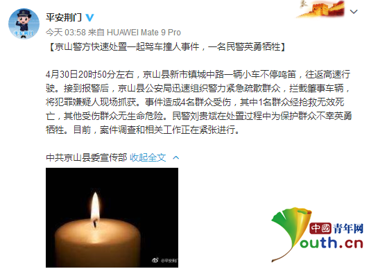 中国青年网北京5月1日电今日凌晨,湖北省荆门市公安局发布通报称,30日晚一辆小车往返高速行驶,致1名群众死亡4人受伤,另有一名民警牺牲。