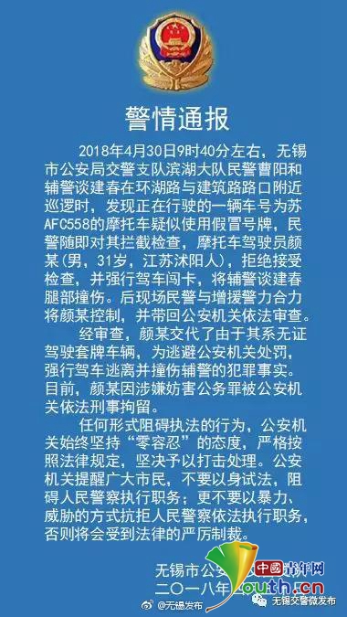30日9时40分左右,无锡市公安局交警支队滨湖大队民警在环湖路与建筑路路口附近巡逻时,发现正在行驶的一辆车号为苏AFC558的摩托车疑似使用假冒号牌,民警随即对其拦截检查,摩托车驾驶员颜某(男,31岁,江苏沭阳人),拒绝接受检查,并强行驾车闯卡,将辅警腿部撞伤。后现场民警与增援警力合力将颜某控制。