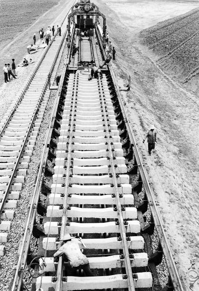 ▲1983年,京秦复线和电气化铁路架桥铺轨工程现场,可以清晰地看到传统有缝、有砟轨道的铺设方式。 李晞摄
