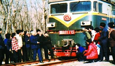 ▲北交大学生1978年铁路实践学习:上世纪70年代末,在我国铁路线路上运行的韶山1型电力机车最高时速只有90公里,使用的是老式有砟轨道。(图片由北京交通大学提供)