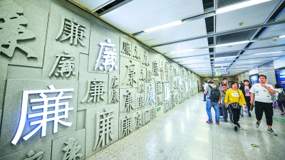 走进六里桥站东北口,一面巨大的廉字墙映入眼帘,这是由涵盖篆、隶、楷、草、行等15种字体共107个“廉”字所组成的。进入到地铁站厅内,扶梯、通道、柱体上的宣传主题都是围绕宪法和监察法的内容,站内各个大屏幕也在滚动播放学习宣传宪法、监察法的视频。