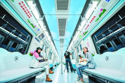 首列“清风北京”廉洁文化主题列车为一列地铁10号线列车,车厢内座椅、扶手、广告位等处均可看到宪法、监察法宣传内容和廉洁诗词。