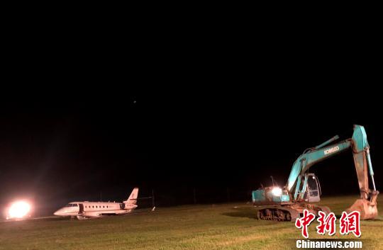 图为一公务机冲出跑道,扬州泰州国际机场连夜处置。 崔佳明 摄