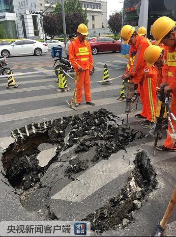 据现场的路政抢险人员介绍,目前,他们正在对塌陷路面进行破除,在破除后由管线单位以及检测单位的相关人员进行勘察检测后制定回填方案进行道路回填。现场抢险人员表示,他们将力争在今天晚高峰到来之前完成道路回填工作,尽量减少由于塌陷对交通造成的影响。(央视记者 何畅 胡亚利)