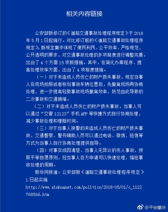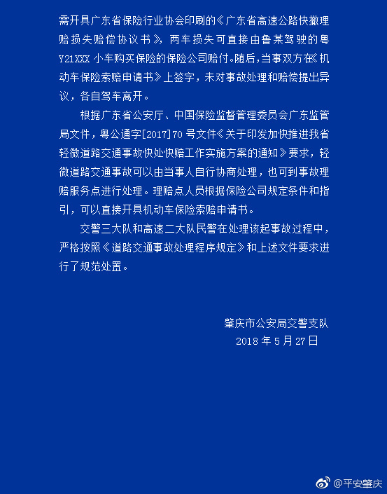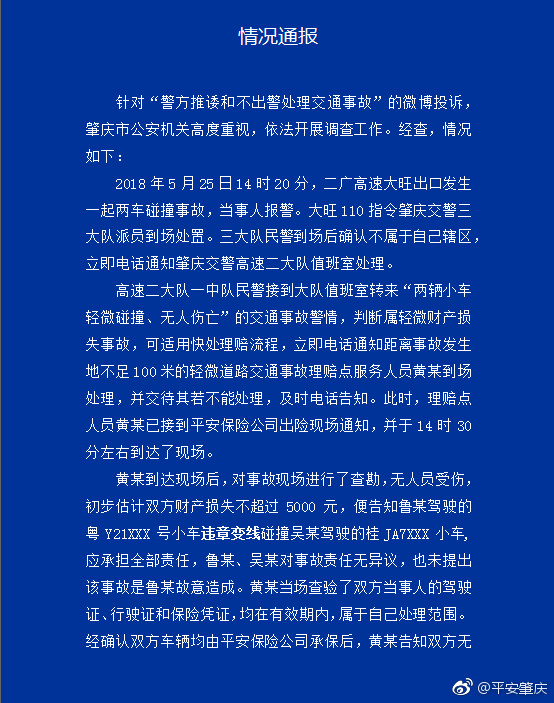 中国青年网北京5月27日电针对“警方推诿和不出警处理交通事故”的微博投诉,广东省肇庆市公安局27日下午通过官方微博发布通报进行了回应:民警在处理事故过程中,严格按照《道路交通事故处理程序规定》和相关文件要求进行了处置。