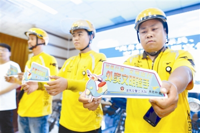 外卖骑手在展示外卖文明骑手标牌(5月30日摄)。