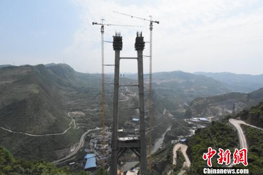 赤水河大桥是一座典型的超高墩、大跨度、特长山区高速公路桥梁,桥梁全长2009米,主跨长达1200米,是目前亚洲同类型桥梁中跨径最大的山区峡谷大桥。并且,赤水河大桥并未在赤水河中修建桥墩,作为一座悬索桥,它主要利用两岸的锚和主墩来支撑起整个桥面。“简单来说就是在赤水河两岸分别修一个很重的钢筋水泥块,把大桥钢索系在锚上,利用锚的重量,从而把钢结构的桥面给‘绷直’承受桥面拉力。”四川路桥赤水河岸项目经理郭勇告诉记者。