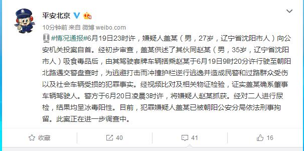 中新网6月20日电 据北京市公安局官方微博消息:6月19日23时许,嫌疑人盖某(男,27岁,辽宁省沈阳市人)向公安机关投案自首。经初步审查,盖某供述了其伙同赵某(男,35岁,辽宁省沈阳市人)吸食毒品后,由其驾驶套牌车辆搭乘赵某于6月19日9时20分许行驶至朝阳北路遇交警盘查时,为逃避打击而冲撞护栏逆行逃逸并造成民警和过路群众受伤以及社会车辆受损的犯罪事实。经视频比对及相关物证检验,证实盖某确系肇事车辆驾驶人。警方于6月20日凌晨3时许,将嫌疑人赵某抓获。经对二人进行尿检,结果均呈冰毒阳性。目前,犯罪嫌疑人盖某已被朝阳公安分局依法刑事拘留。此案正在进一步调查中。