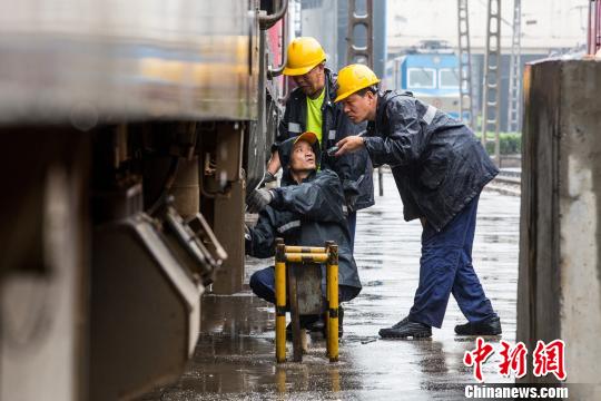 图为检修工长带领职工冒雨认真检查客运火车头车钩。 刘翔 摄
