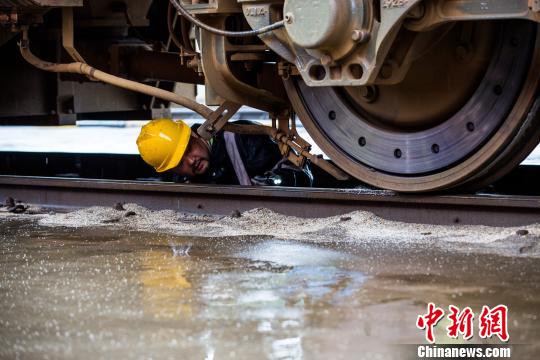 图为检修职工在雨中检查客运火车头撒砂器。 刘翔 摄