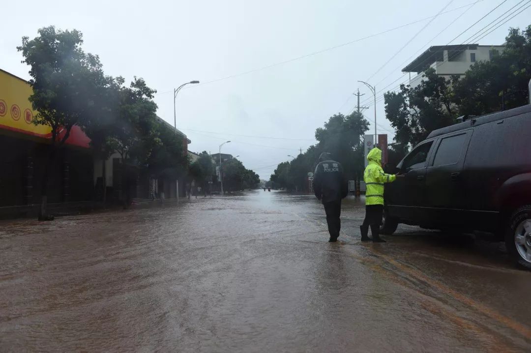 蒲江交警在和平大桥执勤,大桥已经被淹↓
