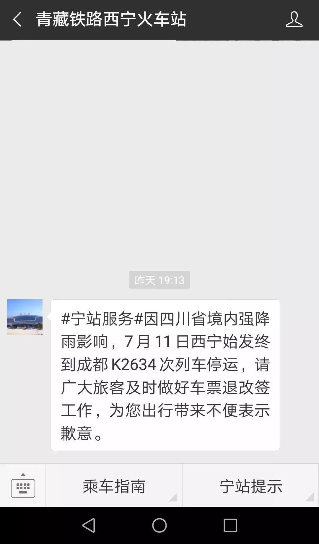 记者7月11日西宁火车站获悉,受到兰州局陇海线,成都局兰渝线,西安局太中银等线降雨的影响,T308次乌鲁木齐至福州列车、K2633次成都至西宁列车和K2634次西宁至成都列车3趟列车停运,13趟抵达西宁的列车晚点。