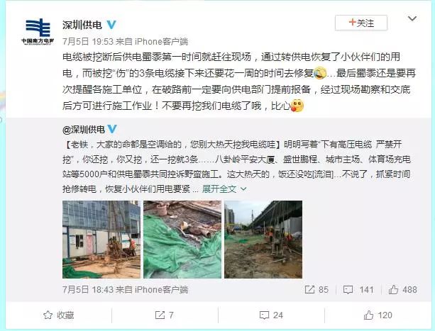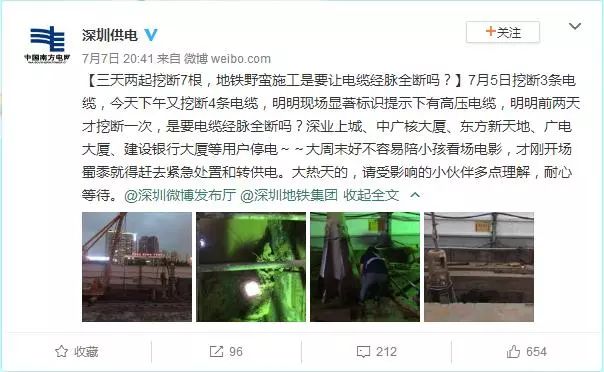 由于深圳地铁在施工中三天内挖断七根电缆,深圳供电局7月5日、7日连发多条微博隔空喊话深圳地铁“地铁野蛮施工是要让电缆经脉全断吗?”