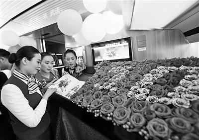 京津城际列车上放置了10周年字样的鲜花摄影/本报记者 郝羿