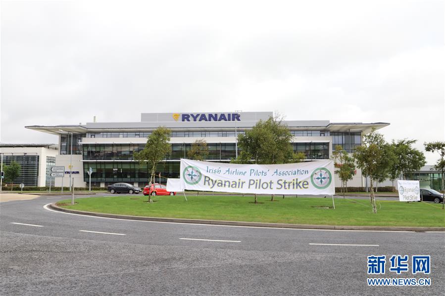 这是8月3日在爱尔兰首都都柏林瑞安航空总部办公楼前拍摄的罢工标语。