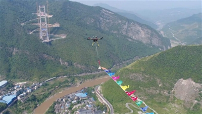 此次先导索采用高强度高韧性的“韩国丝”,直径2mm、长2000米,由GPS自控导航式无人机携带。起飞指令一发出,操纵者就操控无人机从贵州岸243.5米高的塔顶起飞,飞越1200米的赤水河峡谷,大约9分钟后,到达四川岸228.5米的主塔塔顶,将赤水河特大桥两岸主墩索塔连为一体。