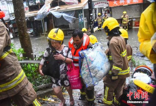9月16日,强台风“山竹”当日逼近香港,消防员正协助居民离开受水浸影响的地区。中新社记者 麦尚旻 摄