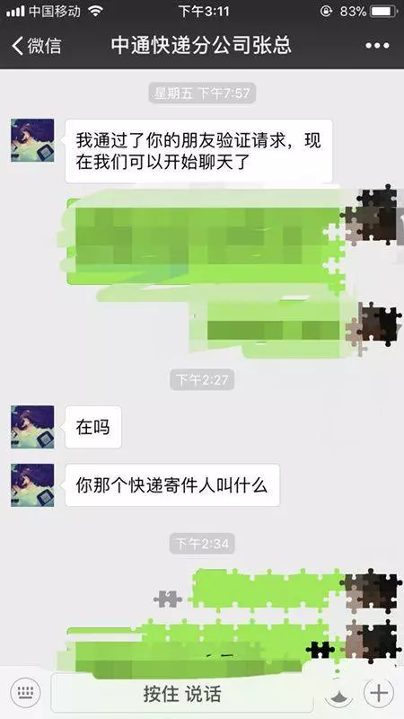 而另一个微信,小丽怀疑是涉案快递员的号码,发来两条微信,重复说了两遍“快递的事情联系1508855xxxx,之前的人已经离职。”小丽称,不知道是中通从警方拿走了涉案快递员的“工作电话”,还是嫌疑人在警方刑拘之前发出的“尽职尽责”的通告。