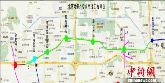 北京地铁6号线西延工程西起金安桥站,东至6号线一期工程五路居站,全长10.556公里,共设车站6座,其中换乘站3座,分别是金安桥站、苹果园站及田村站。金安桥站可与S1线及地铁11号线换乘,在苹果园站可与1号线、S1线换乘,在田村站与建设中的地铁3号线和规划中的L6线换乘。