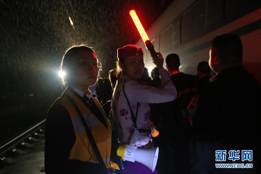 9月26日,在凯里南站,铁路工作人员进行旅客疏散换乘模拟演练。 当日,中国铁路成都局集团公司在沪昆高铁贵州境内的凯里南至三穗区间举行模拟动车组故障应急救援演练,以检验和提高突发事件应急处理能力,迎接“十一”黄金周。新华社发(吴吉斌 摄)