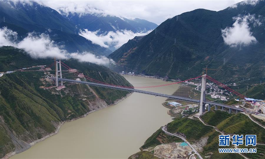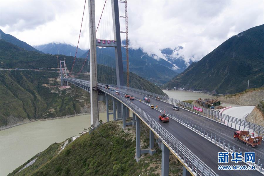 当日,雅康高速泸定大渡河兴康特大桥桥面施工完成,具备了通行能力,为实现雅康高速全线通车奠定坚实基础。据悉,该桥为全长1411米的超大跨径钢桁梁悬索桥,是雅康高速公路的控制性工程之一,被誉为“川藏第一桥”。 新华社记者 江宏景 摄