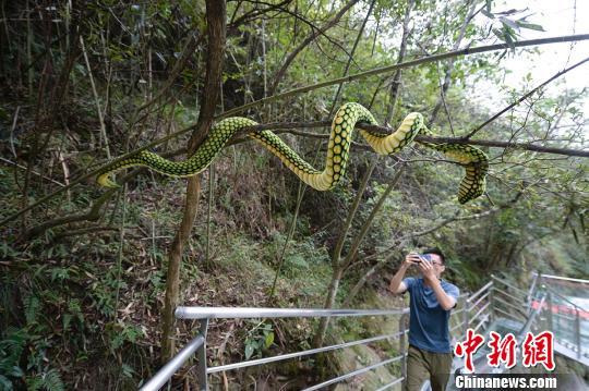 仿真蛇吸引游人驻足。 胡坚 摄