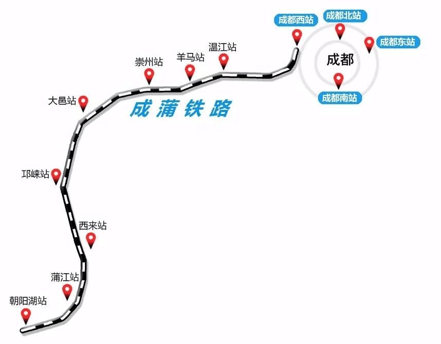 全线除利用既有成都西站进行改造外,还新建有温江、羊马、崇州、大邑、邛崃、西来、蒲江、朝阳湖8个车站。