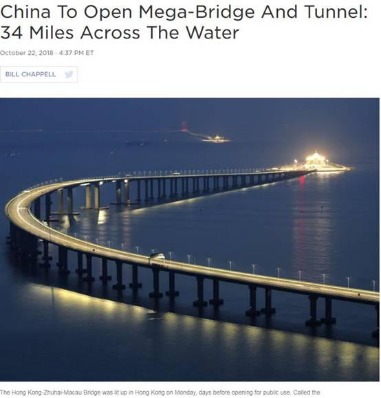 今年5月,美国有线电视新闻网(CNN)网站刊登记者莎拉·拉扎勒斯的文章称,港珠澳大桥是中国发展自己的粤港澳大湾区宏伟计划的核心,它希望这一地区的技术创新和经济发展成就可媲美旧金山、纽约和东京的湾区。这座巨大的钢筋混凝土大桥不仅证明了中国建造创纪录巨型建筑的能力,也充分反映了这个国家不断增强的地缘政治信心。这座大桥毫无疑问是工程上的非凡壮举。