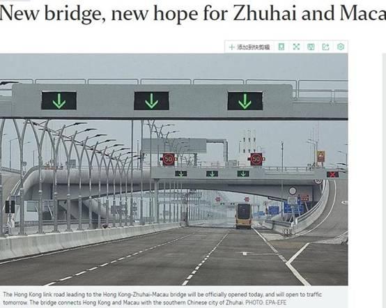 新加坡《海峡时报》网站刊发了题为《新大桥,珠海和澳门的新希望》的文章,称港珠澳大桥所处地区的居民和商界人士希望大桥的通车能推动当地经济的发展。