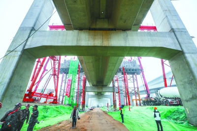 高空浇筑作业一直持续到了下午3时,这一轴长40米、重600吨的上盖梁最终浇筑成功。“新机场线施工最难的一段终于打通了!”项目经理宁伟感慨道。桥面上,党旗和团旗迎风飘扬,分外鲜艳,已经在这儿坚守了快一年半的工人们兴奋地鼓掌庆祝。