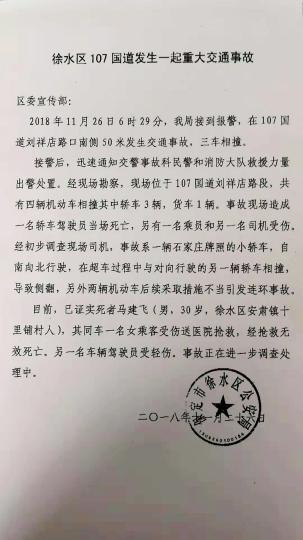 通报称,26日6时29分,该局接到报警称,在107国道刘祥口路口南侧50米(保定市徐水区境内)发生交通事故。