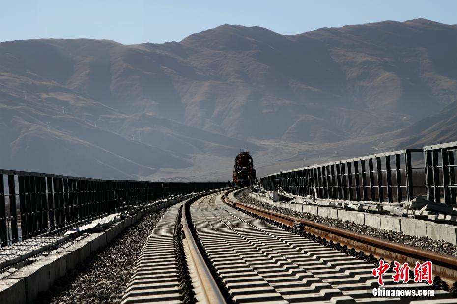 11月26日,中铁十一局三公司拉林铁路项目部铺架二队工人铺设拉林铁路首跨贡嘎雅鲁藏布江特大桥铁轨。拉林铁路共计上跨雅鲁藏布江16处,贡嘎雅鲁藏布江特大桥全长5727米,为拉林铁路全线最长桥梁。拉林铁路起于西藏自治区首府拉萨,终点为林芝市,拉林铁路新建正线铺轨403.14千米,运营长度435.48千米。图为部分铁路已经铺设完成。中新社记者 赵朗 摄