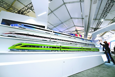 在中国铁路科技创新成就展室内展区,多款“复兴号”新型动车组模型亮相。本报记者 和冠欣摄